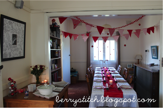 For those that know me, I am a little anal, so, if it wasn't red or white, or necessary for eating, it wasn't allowed... hehe.. I strung up some red baubles and a felt cut-out string from the window and the arch way. Another thing I sewed for the day was a table runner. It was plain red, and straight (nothing all that fancy) with some ribbon sewed down the sides and the end. At the side was our food table, decorated with just a few red and white things.